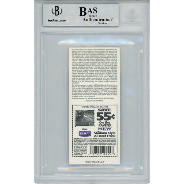 The number in the listing title is just an inventory sku for our records and is not the authentication number. The item pictured is the exact item you will receive, please see photos for condition. This is a Baltimore Ravens Slabbed 11/30/03 Ticket Stub that was personally autographed by Ray Lewis. Includes a certificate of authenticity from Beckett Authentication Services (BAS) and Denver Autographs.FREE SHIPPING within the USA on orders over $10!