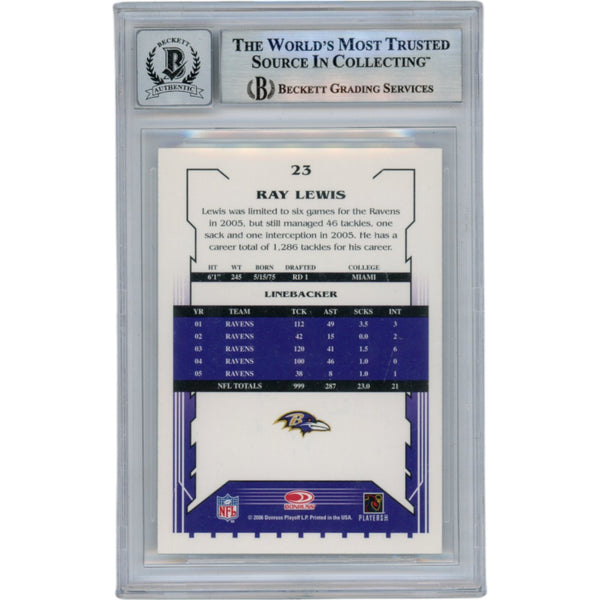 The number in the listing title is just an inventory sku for our records and is not the authentication number. The item pictured is the exact item you will receive, please see photos for condition. This is a Baltimore Ravens 2006 Score #23 Slabbed Trading Card that was personally autographed by Ray Lewis. Includes a certificate of authenticity from Beckett Authentication Services (BAS) and Denver Autographs.FREE SHIPPING within the USA on orders over $10!