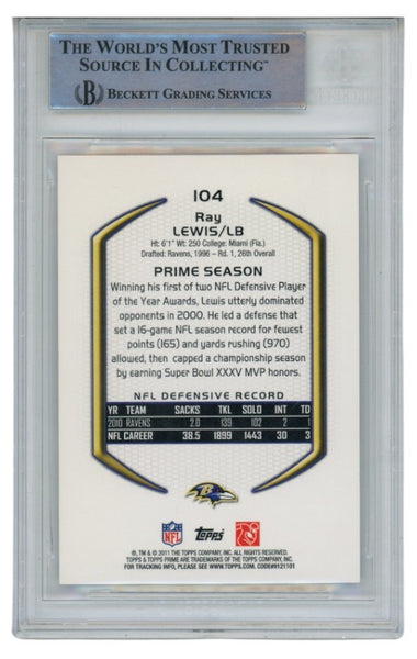 The number in the listing title is just an inventory sku for our records and is not the authentication number. The item pictured is the exact image you will receive, please see photos for condition. This is a Baltimore Ravens 2011 Topps #104 Slabbed Trading Card that was personally autographed by Ray Lewis. Includes a certificate of authenticity from Beckett Authentication Services (BAS) and Denver Autographs. FREE SHIPPING within the USA on orders over $10!