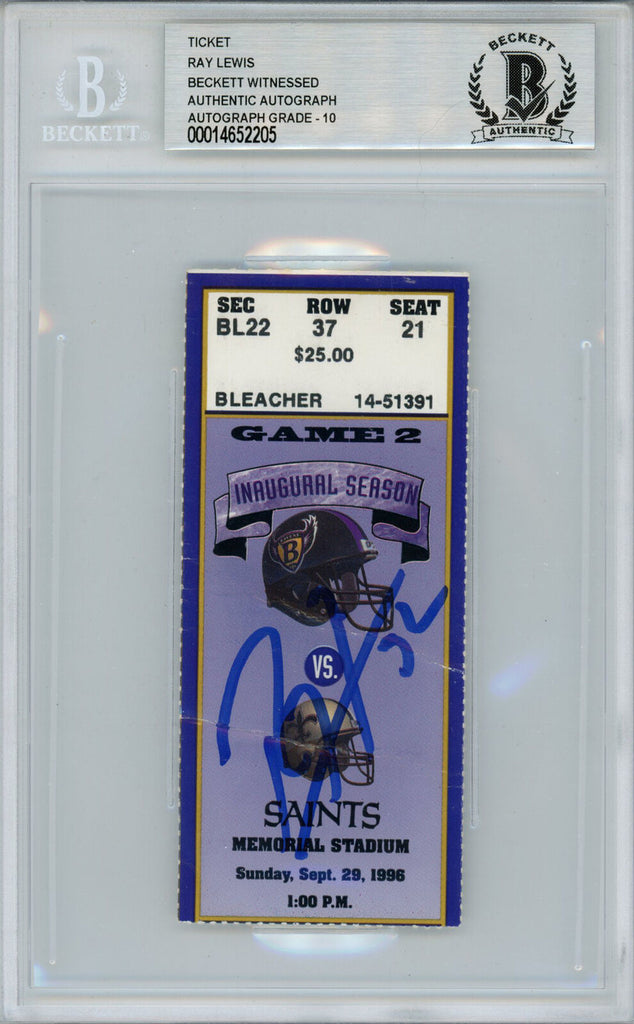 Ray Lewis Autographed/Signed 9/29/1996 vs Saints Ticket Beckett Slab 39194 The number in the listing title is just an inventory sku for our records and is not the authentication number. This is the exact item that you will receive so please see scans for condition. This is a official ticket that was personally autographed by Ray Lewis. This has been professionally slabbed by Beckett Authentication Services and includes a certificate of authenticity from Denver Autographs.