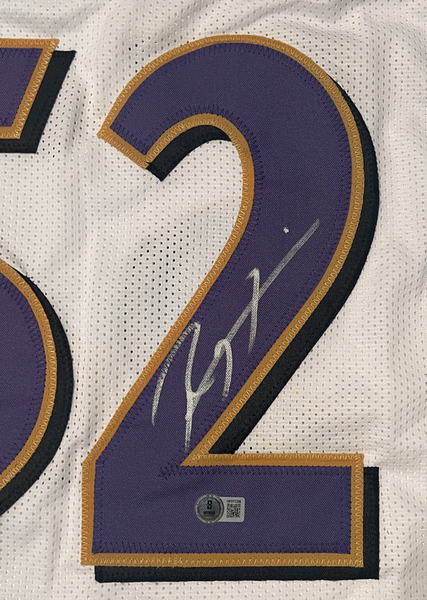 This custom white jersey has been personally hand-signed by Ray Lewis of the Baltimore Ravens. It comes with an individually numbered, tamper-evident hologram from Beckett Authentic. To ensure authenticity, the hologram can be reviewed online. This process helps to ensure that the product purchased is authentic and eliminates any possibility of duplication or fraud.