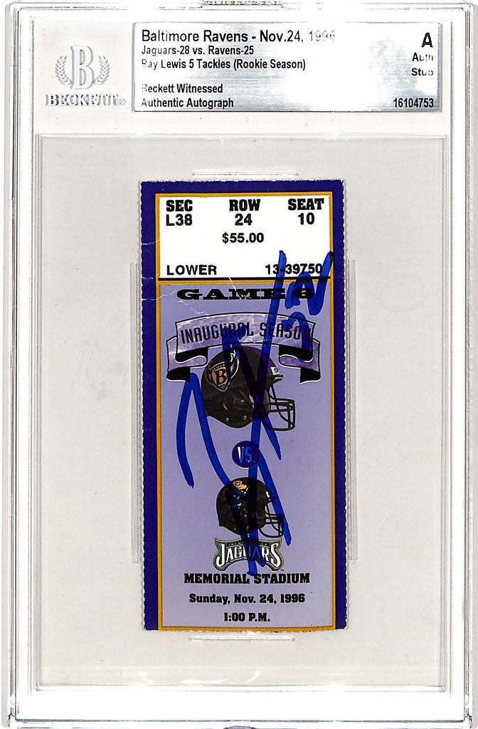 Ray Lewis Signed Baltimore Ravens 11/24/96 Ticket Stub Slab Beckett 42756 The number in the listing title is just an inventory sku for our records and is not the authentication number. The item pictured is a the exact item you will receive, please see photos for condition. This is a Baltimore Ravens Slabbed Ticket Stub 11/24/96 that was personally autographed by Ray Lewis. Includes a certificate of authenticity from Beckett Authentication Services (BAS) and Denver Autographs.
