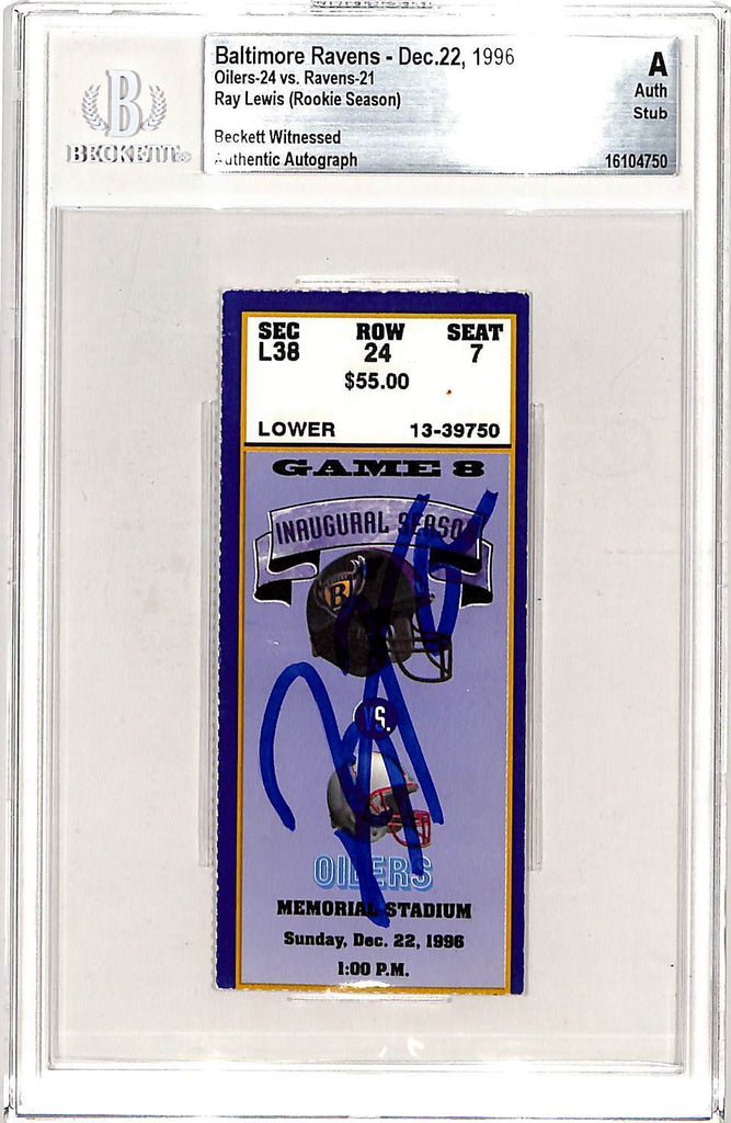 Ray Lewis Signed Baltimore Ravens 12/22/96 Ticket Stub Slab Beckett 42758 The number in the listing title is just an inventory sku for our records and is not the authentication number. The item pictured is a the exact item you will receive, please see photos for condition. This is a Baltimore Ravens Slabbed Ticket Stub 12/22/96 that was personally autographed by Ray Lewis. Includes a certificate of authenticity from Beckett Authentication Services (BAS) and Denver Autographs.