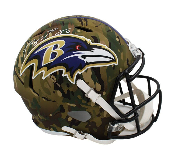 A Baltimore Ravens Speed Replica Camo NFL Helmet hand signed by Roquan Smith. The item and signature are in excellent condition. Roquan played college football at Georgia and is a linebacker for the Baltimore Ravens. He was named MVP of the SEC Championship Game and was the first Georgia Bulldog to win the Butkus Award. AUTHENTICATION: Your item has been tagged with a SmarTag Powered by Prova Technology, which gives you digital access to your items authentication records, including a proof picture from the signing.