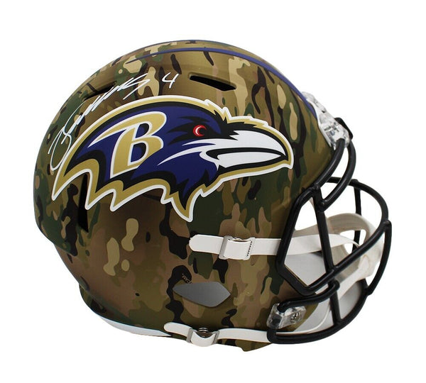A Baltimore Ravens Speed Replica Camo NFL Helmet hand signed by Zay Flowers. The item and signature are in excellent condition. Zay is a football wide receiver for the Baltimore Ravens. He was drafted in 2023 after playing college football at Boston University. AUTHENTICATION: The item is accompanied by a Beckett Serial Numbered and Databased Hologram.