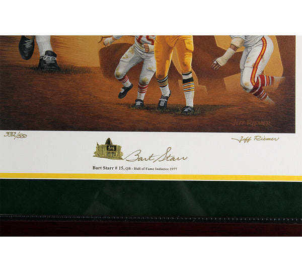 An Green Bay Framed 24x19 Photo-Hall of Fame Commemorative hand signed by Bart Star. The item and signature are in excellent condition. The frame measures approximately 26" x 31".Bart was drafted into the NFL in 1956 Round:17, Pick:200. Bart 2xSuper Bowl champion (I,II). Bart 2xSuper Bowl MVP (I,II). Bart 5xNFL champion (1961,1962,1965-1967).Bart was a NFL Most Valuable Player (1966).AUTHENTICATION: The item is accompanied by a Bart Starr Exclusive Certificate of Authenticity - Bart Starr Exclusive Serial Numbered and Databased Hologram