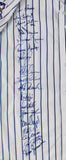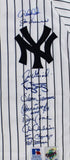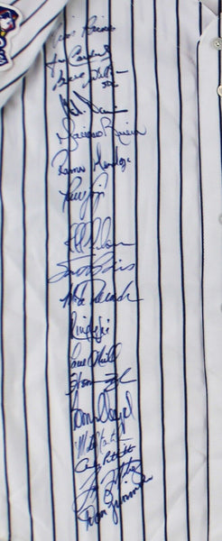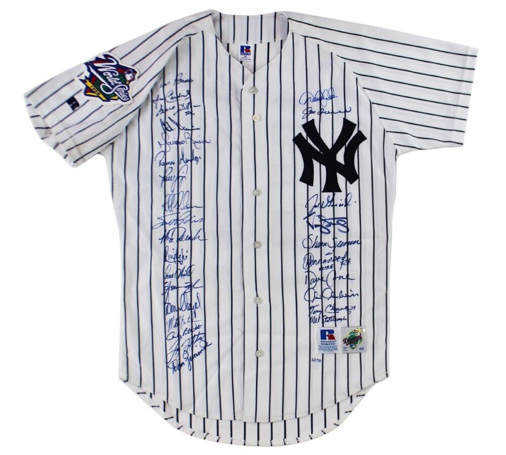 A 1998 New York Yankees Team - World Series Champions hand signed by Derek Jeter, Joe Torre, Tim Raines, Bernie Williams, Mariano Rivera, Jorge Posada, Paul O'Neil, Andy Petitie, Tino Martinez, Joe Girardi, Graeme Lloyd, Don Zimmer, Jeff Nelson, Homer Bush, Jose Cardenal, Chris Chambliss, David Cone, Shane Spencer Ramiro Mendoza and others. The item is a limited edition. Buyer will receive number 62 of 98. The jersey features a 1998 World Series Patch on the sleeve and has a few minor areas of discoloration. AUTHENTICATION: The item is accompanied by a Beckett Letter of Authenticity.