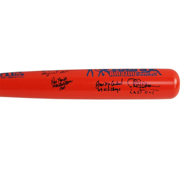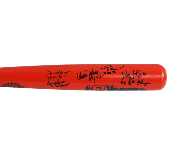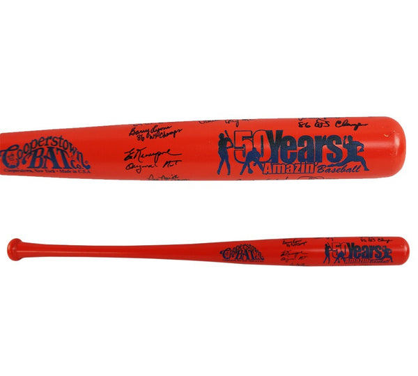 A Coopertown Custom 50 Years Orange MLB Bat hand signed by 9 New York Mets Alumni including Duffy Dyer, Barry Lyons, Wally Backman, Ed Kranepool, Ray Knight, Cleon Jones, Jim McAndrew, Ron Darling, and Todd Hundley. The item and signature are in excellent condition. AUTHENTICATION: The item is accompanied by a Beckett Letter of Authenticity - Beckett Serial Numbered and Databased Hologram.
