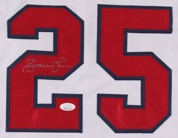 Custom on-field style jersey. Everything is sewn on, size XL. Hand-signed in silver felt-tip pen by Andruw Jones. The lot / autograph(s) includes an official James Spence Authentication (JSA) hologram and matching COA for authenticity purposes.Authentication: JSA COA