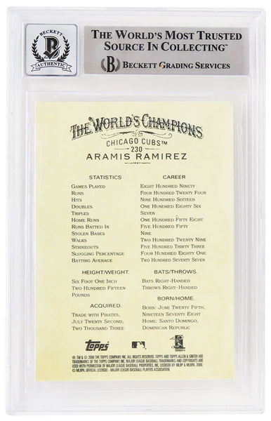 Aramis Ramirez signed Chicago Cubs 2006 Allen & Ginter baseball card #230. The card has been authenticated and encapsulated by Beckett Authentic and the autograph has been graded a Mint 10. The authentication number can be verified online. Only the autograph has been graded a 10 by Beckett Authentic, the card itself is ungraded. The image of the item is a stock photo, as we may have multiples of the item in stock. The Slabbed Card you will receive will be of the card described. (Same grade, Same authentication) You may or may not receive the exact Beckett serial number on the slab label shown in image.