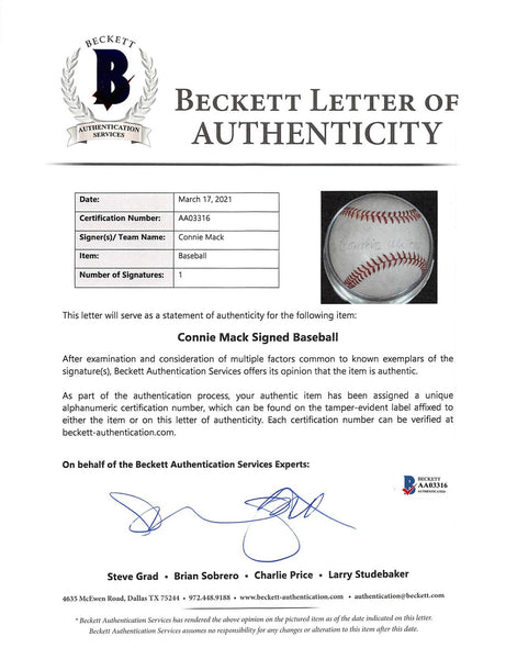 This Autographed Reach Official League Baseball has been Personally Signed by Connie Mack of the Philadelphia Athletics . This item is 100% Authentic to include a Certificate of Authenticity (COA) / hologram by Beckett Authentication Services. The authenticity can be verified on Beckett Authentication Services website.