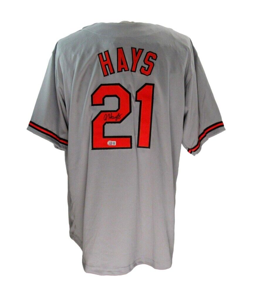 Custom on-field style jersey. Everything is sewn on, size XL. Has been hand-signed by Austin Hays.The lot / autograph(s) includes an official Beckett Authentication Services serially-numbered hologram and QR Code card for authenticity purposes. The signing of this item was witnessed by Beckett.Authentication: Beckett Hologram with QR Code card