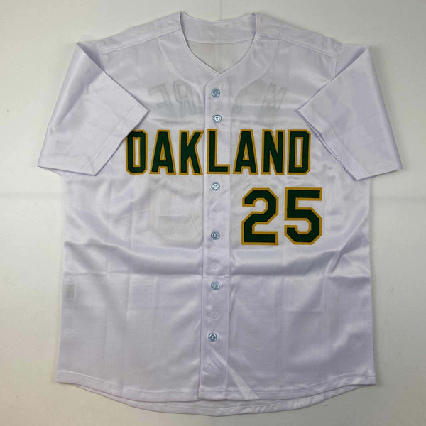 Autographed/Signed Mark McGwire Oakland White Baseball Jersey JSA COA Jersey has no brand names or logos. This is a custom jersey and was not manufactured by or in any manner associated with any professional sports league or manufacturer. This custom jersey carries no professional sports league designation. The item is intended to be an autographed collectible. The custom jersey displays the name and number of the player. This item in no way is affiliated with or connected to any professional sports organization. Size is XL.