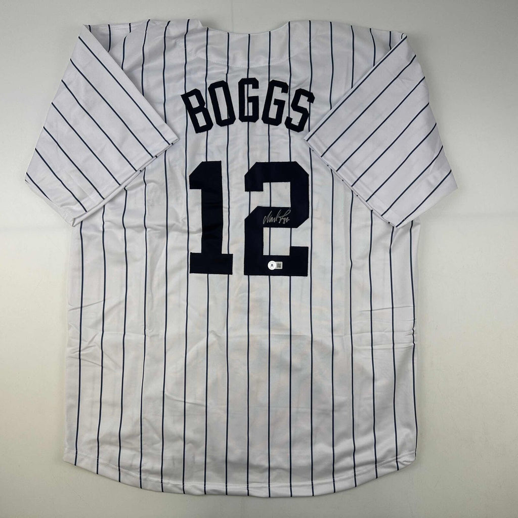Autographed/Signed Wade Boggs New York Pinstripe Baseball Jersey Beckett BAS COA Jersey has no brand names or logos. This is a custom jersey and was not manufactured by or in any manner associated with any professional sports league or manufacturer. This custom jersey carries no professional sports league designation. The item is intended to be an autographed collectible. The custom jersey displays the name and number of the player. This item in no way is affiliated with or connected to any professional sports organization. Size is XL.
