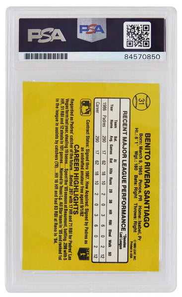 Benito Santiago signed San Diego Padres 1987 Donruss rookie baseball card #31. The card has been authenticated and encapsulated by PSA/DNA and the number can be verified online. The image of the item is a stock photo, as we may have multiples of the item in stock. The Slabbed Card you will receive will be of the card described. (Same grade, Same authentication) You may or may not receive the exact PSA serial number on the slab label shown in image.