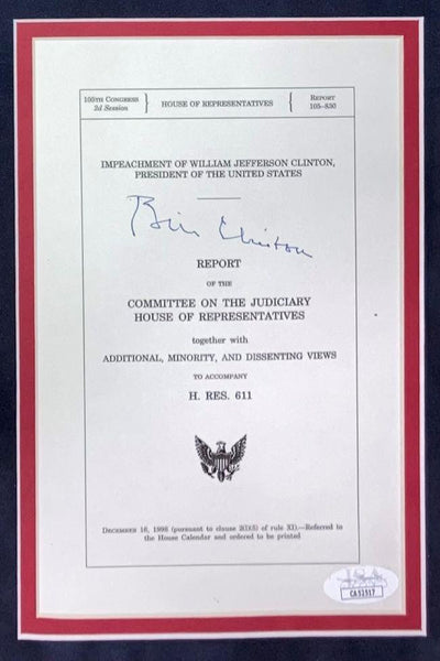 Featured is a Bill Clinton signed 5x8 mock impeachment letter insert. This insert has been hand signed by Clinton and comes with the JSA hologram and certificate of authenticity. This insert has been professionally framed and matted and is approximately 16x24. This insert would be a great addition to any entertainment memorabilia collection! SPECIFICATIONS Autographed By: Bill Clinton Team: Sport: Authentication: James Spence Authentication (JSA)
