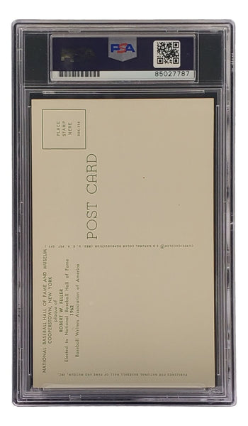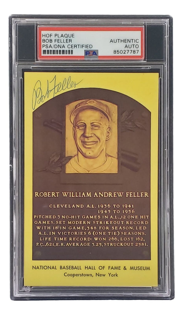 Featured is a Bob Feller Cleveland signed 4x6 Hall Of Fame plaque card. This card has been hand signed by Feller and has been authenticated and encapsulated by PSA/DNA. This card would make a great addition to any sports memorabilia collection! SPECIFICATIONS Autographed By: Bob Feller Team: Cleveland Sport: Baseball Authentication: Professional Sports Authenticator (PSA)