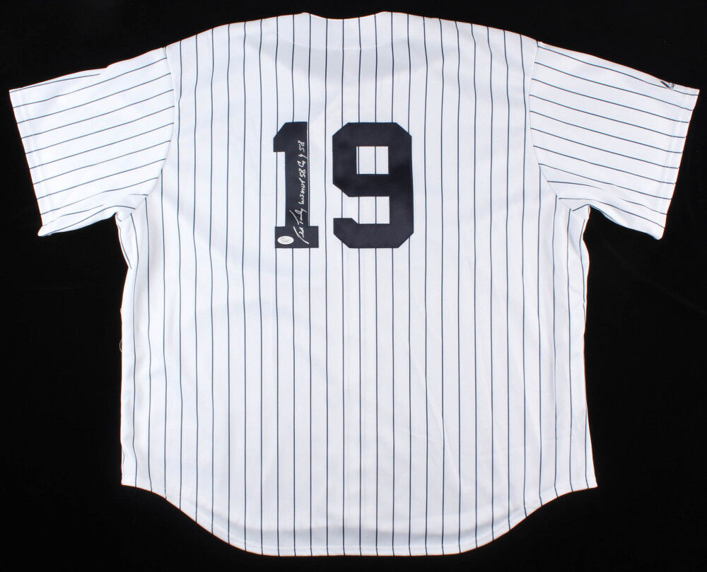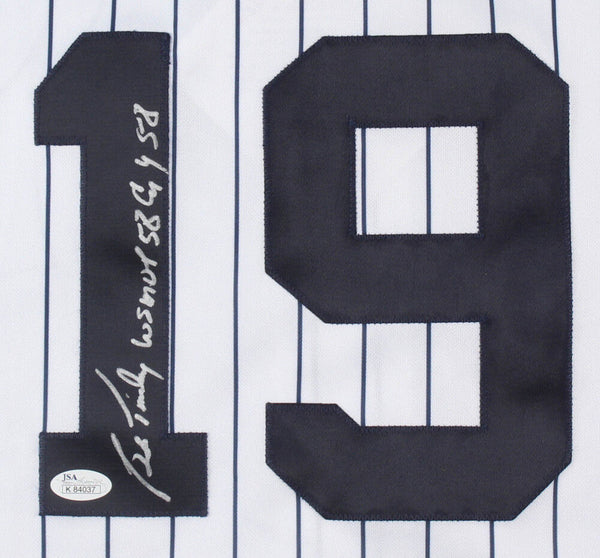 Custom on-field style jersey. Everything is sewn on, size 3XL. Hand-signed and inscribed in silver paint pen by Bob Turley (D. 2013). Jersey is Inscribed "WS MVP 58" & "CY 58"The lot / autograph(s) includes an official James Spence Authentication (JSA) hologram and matching COA for authenticity purposes.Authentication: JSA COA