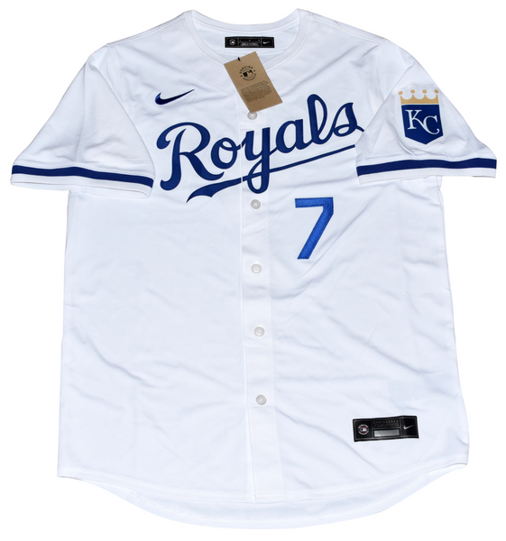 Bobby Witt Jr, All-Star shortstop for the Kansas City Royals, has hand signed this Royals white Nike jersey at a private signing. Jersey is new with tags attached and all letters/numbers are sewn-on. This item is authenticated by Beckett Authentication Services and was signed in the presence of one of their representatives. Their tamper-evident hologram featuring a QR code and serial number is on the item. The authenticity can be verified online by entering the serial number or scanning the QR code.Item pictured may not be the exact item you will receive. It will be similar quality, and we guarantee your satisfaction.