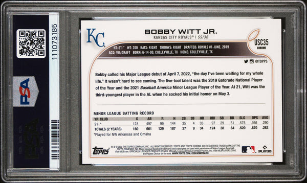 This Autographed Card Graded Mint 9 Auto Graded Gem Mint 10! 2022 Topps Chrome Update Purple Refractor #USC35 Rookie Card has been Personally Signed by Bobby Witt Jr. of the Kansas City Royals. This item is 100% Authentic, it comes slabbed and authenticated by PSA. This item is not autographed. The authenticity can be verified on Professional Sports Authenticator website.