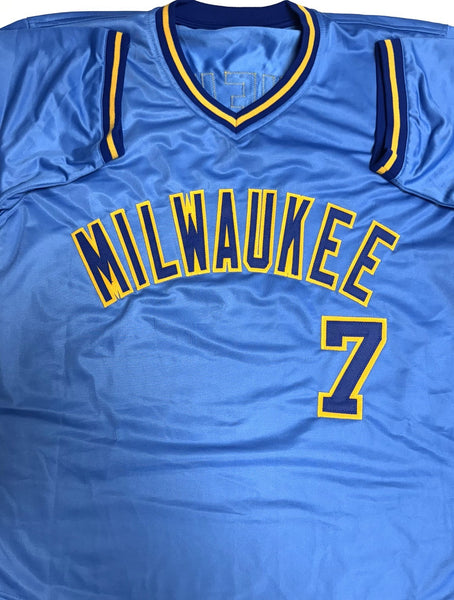 Custom Replica Jersey of former Milwaukee Brewers Infielder DALE SVEUM. This jersey is signed with Silver Paint Pen. This jersey is size XL with all letters and numbers sewn in. This item was signed at a signing in our store and would make a great addition to any Brewers collection. This autograph is guaranteed to be 100% authentic and will include a COA hologram from Beckett Authentication.
