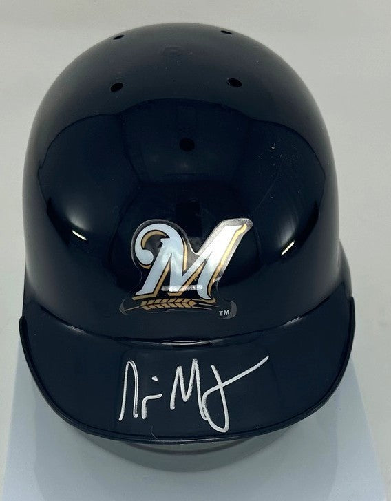 Riddell Mini helmet by Milwaukee Brewers Outfielder NYJER MORGAN. This item is signed in white paint pen. This item was signed at a private signing and would make a great addition to any Brewers collection. This autograph is guaranteed to be 100% authentic and will include a COA hologram from Beckett authentication.