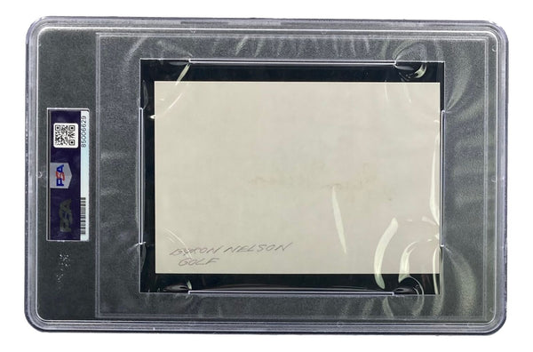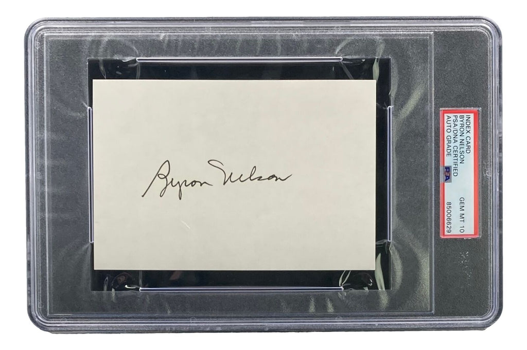 Featured is a Byron Nelson signed index card. This card has been hand signed by Nelson and has been authenticated and encapsulated by PSA, receiving an autograph grade of Gem MT 10. This card would make a great addition to any sports memorabilia collection! SPECIFICATIONS Autographed By: Byron Nelson Team: Sport: Golf-PGA Authentication: Professional Sports Authenticator (PSA)
