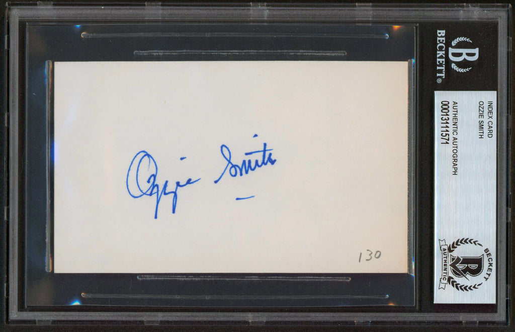 This Autographed 3x5 Index Card has been Personally Signed by Ozzie Smith of the St. Louis Cardinals. This item is 100% Authentic, it comes slabbed and authenticated by Beckett Authentication Services. The authenticity can be verified on Beckett Authentication Services website.