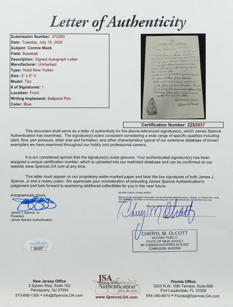 Featured is a Connie Mack signed, hand written letter. This letter has been hand written by Mack and comes with the JSA hologram and letter of authenticity. This letter would make a great addition to any sports memorabilia collection!. SPECIFICATIONS Autographed By: Connie Mack Team: Philadelphia Athletics Sport: Baseball Authentication: James Spence Authentication (JSA)