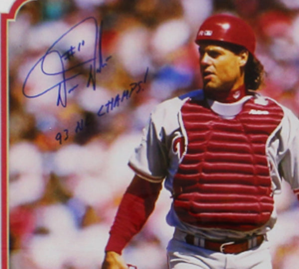 A Philadelphia Phillies Framed 16x20 Dutch MLB Photo hand signed by Darren Daulton. The item and signature are in excellent condition. The frame measures approximately 26x31. In addition to signing his name, Darren inscribed "93 NL Champs!" on the item. Darren "Dutch" Daulton MLB catcher best known for his impactful tenure with the Philadelphia Phillies. He was a three-time All-Star (1992, 1993, 1995) and earned the Silver Slugger Award and NL RBI title (109) in 1992. AUTHENTICATION: The item is accompanied by a JSA Certificate of Authenticity - JSA Serial Numbered Hologram -