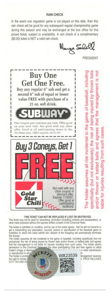 Deion Sanders Signed Cincinnati Reds 4/11/1997 vs Marlins Ticket BAS 37192 The number in the listing title is just an inventory sku for our records and is not the authentication number. The item pictured is a stock photo unless otherwise noted. This is a authentic ticket stub that was personally autographed by Deion Sanders. Includes a certificate of authenticity from Beckett Authentication Services (BAS) and Denver Autographs.