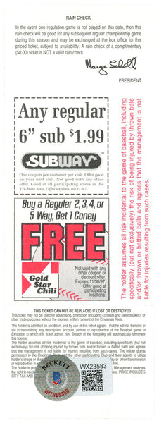 Deion Sanders Signed Cincinnati Reds 7/12/1997 vs Expos Ticket BAS 37217 The number in the listing title is just an inventory sku for our records and is not the authentication number. The item pictured is a stock photo unless otherwise noted. This is a authentic ticket stub that was personally autographed by Deion Sanders. Includes a certificate of authenticity from Beckett Authentication Services (BAS) and Denver Autographs.