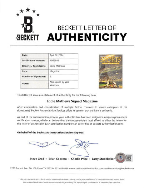 This Autographed Graded 9.2 Sports Illustrated August 16, 1954 First Issue Magazine has been Personally Signed by Eddie Mathews & Wes Westrum. This item is 100% Authentic, it comes slabbed and authenticated by CGC. The authenticity can be verified on CGC website. This also comes with a Letter of Authenticity from Beckett Authentication Services.