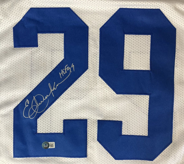 Featured is an Eric Dickerson signed custom football jersey, inscribed "HOF 99". This jersey was hand signed by Dickerson and comes with the Beckett hologram and certificate of authenticity. This jersey features professionally sewn letters and numbers and is size XL. This jersey has no team tags or emblems and is intended as a sports collectible. This jersey would make a great addition to any sports memorabilia collection. SPECIFICATIONS Autographed By: Eric Dickerson Team: Los Angeles Rams Sport: Football Authentication: Beckett Grading Services