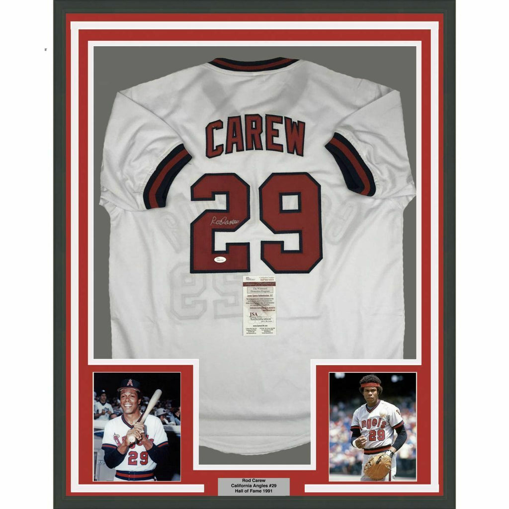 FRAMED Autographed/Signed ROD CAREW 33x42 California White Jersey JSA COA Auto The item is professionally framed & matted with two 8x10 photos, measures 33"x42" and is ready to be hung in your man cave! NOTE: COA card will be mounted on the back of the frame, not inside it on top of the jersey as seen in the picture. Please allow up to 5 business days for the item to be framed, packaged safely, and picked up by USPS. Photo and matting requests can be made.