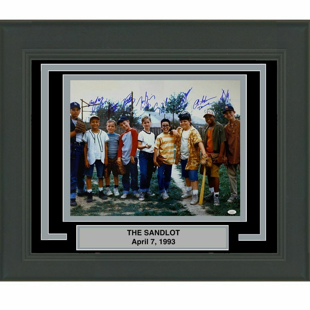 FRAMED Autographed/Signed THE SANDLOT 8x CAST SIGNED 16x20 Movie Photo JSA COA The photo is signed by 8 members of The Sandlot cast and inscribed with their character name: Marty York (Yeah Yeah McClennan), Shane Obedzinski (Tommy Repeat Timmons), Victor Dimattia (Timmy Timmons), Tom Guiry (Scott Smalls), Chauncey Leopardi (Michael Squints Palledorous), Patrick Renna (Ham Porter), Brandon Adams (Kenny DeNunez), & Grant Gelt (Bertram Grover Weeks) and certified by JSA. The item is professionally framed & matted and is ready to be hung in your man cave! NOTE: COA card, if applicable, will be mounted on the back of the frame. Please allow up to 5 business days for the item to be framed, packaged safely, and picked up by USPS. Nameplate and matting requests can be made.