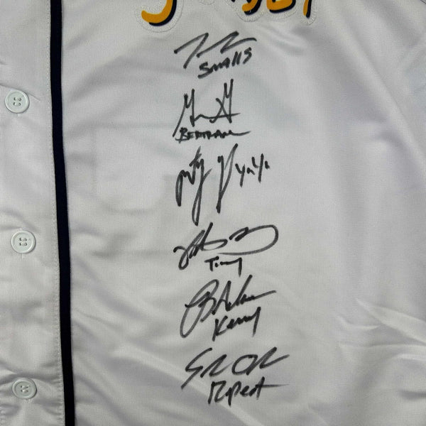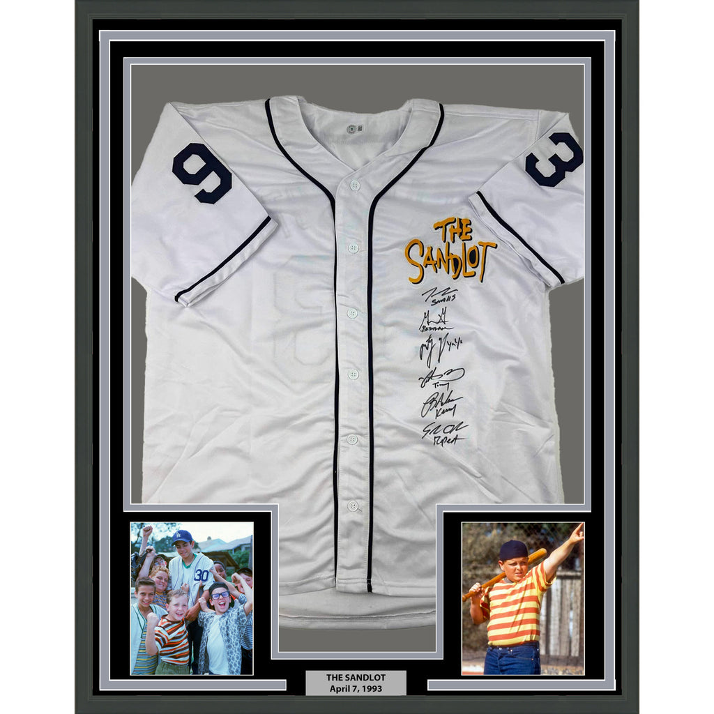 Framed Autographed/Signed The Sandlot Movie 33x42 6x Sigs White Jersey BAS COA The jersey is signed by 6 members of The Sandlot cast: Marty York (Yeah Yeah McClennan), Shane Obedzinski (Tommy Repeat Timmons), Victor Dimattia (Timmy Timmons), Tom Guiry (Scott Smalls), Grant Gelt (Bertram Grover Weeks), and Brandon Adams (Kenny DeNunez) and certified by Beckett. All six actors inscribed their character names.