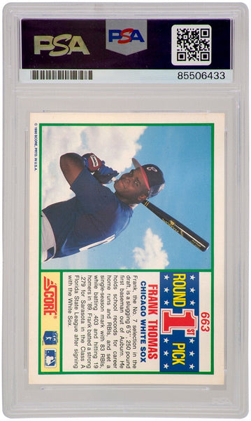 Frank Thomas signed Chicago White Sox 1990 Score rookie baseball trading card #663. The card has been authenticated and encapsulated by PSA/DNA and the number can be verified online.