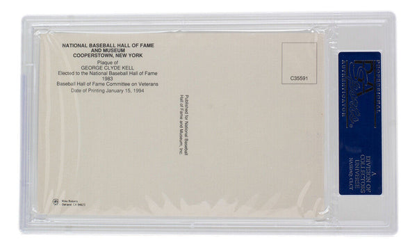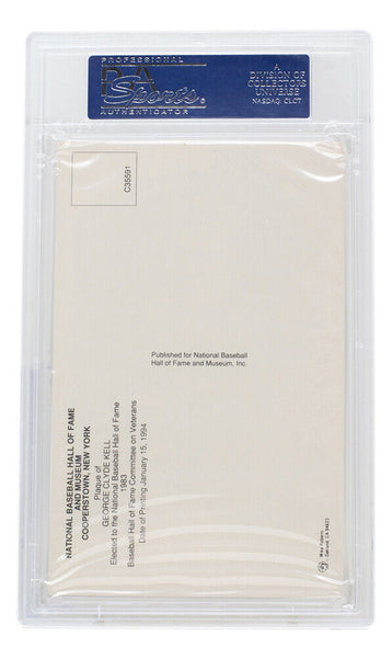 Featured is a George Kell signed Detroit Tigers hall of fame plaque post card. This post card was hand signed by George Kell and slabbed and authenticated by PSA grading services. This item would make a great addition to any sports memorabilia collection.. SPECIFICATIONS Autographed By: George Kell Team: Detroit Tigers Sport: Baseball Authentication: Professional Sports Authenticator (PSA)