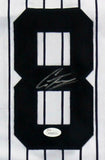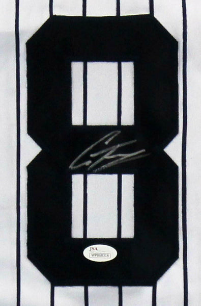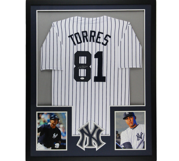 A New York Large Framed Custom Pinstripe Jersey hand signed by Gleyber Torres. The item and signature are in excellent condition. Gleyber was the youngest player in the Arizona Fall League (AFL) in 2016 and is the youngest player ever to win the AFL MVP. Gleyber is ranked as the 5th best prospect in baseball entering the 2018. He is the highest rated New York Yankee on the prospect list. Grab an early piece from this up and coming star!! The framed jersey also features two 8x10 shots of Gleyber. The frame measures 42 x 34. AUTHENTICATION: The item is accompanied by a JSA Certificate of Authenticity - JSA Serial Numbered Hologram - Picture of Gleyber from the signing