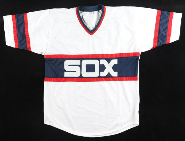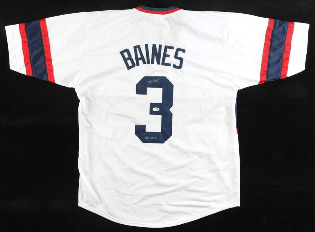 Custom on-field style 1983 Throwback jersey. Everything is sewn on, size XL. Hand-signed and inscribed by Harold Baines (HOF). The autograph includes an official James Spence Authentication (JSA) scannable hologram and QR Code card for authenticity purposes. The signing of this item was witnessed by JSA.Authentication: JSA Scannable Hologram with QR Code card