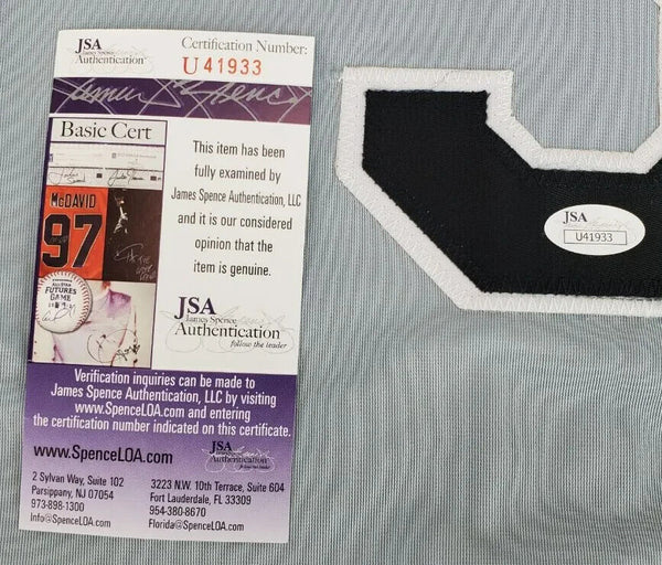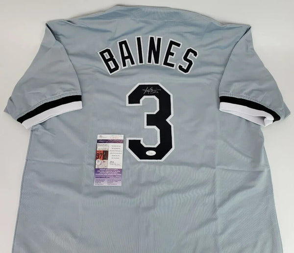 This autographed jersey has been personally hand-signed by Harold Baines of the Chicago White Sox.This autograph is certified by James Spence Authentication (JSA). It comes with the numbered hologram and matching Certificate of Authenticity.Custom on-field style jerseys are a more affordable option for autograph seekers. These jerseys do not have any brand name or tags and are made in the Philippines. They feature stitched on names and numbers and are made to look very similar to the on-field jerseys that the players wear. These custom jerseys are very commonly used in the memorabilia industry.
