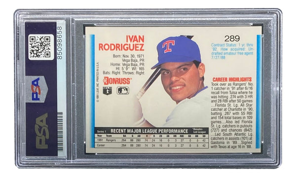Featured is an Ivan Rodriguez Texas Rangers signed 1991 Leaf #289 rookie card. This card has been hand signed by Rodriguez and has been authenticated and encapsulated by PSA. This card would make a great addition to any sports memorabilia collection!. SPECIFICATIONS Autographed By: Ivan Rodriguez Team: Texas Rangers Sport: Baseball Authentication: Professional Sports Authenticator (PSA)