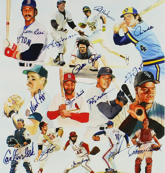 A Field of Dreams A Team of Dreams Unframed 16x23 MLB Print hand signed by artist James Florentino and Athletes Jim Rice, Reggie Jackson, Rickey Henderson, Paul Molitor, Pete Rose, Wade Boggs, Ozzie Smith, Rod Carew, Frank Thomas, Johnny Bench, Doc Gooden, Bruce Sutter, Jim Palmer and Carlton Fisk. The Print is PP 2 of 14. AUTHENTICATION: The item is tagged with a Beckett Serial Numbered and Databased Hologram.