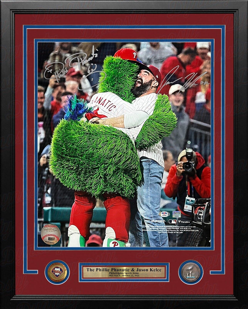 The Phillie Phanatic & Jason Kelce 2022 NLCS Autographed 16" x 20" Framed Baseball Photo Baseball photo autographed by Phillie Phanatic Tom Burgoyne and Eagles legend Jason Kelce; authenticated by PSA and Dynasty Sports This officially licensed 2022 NLCS baseball photo has been hand-signed by the Phillie Phanatic (Tom Burgoyne) and Eagles Super Bowl Champion Jason Kelce. All autographed memorabilia includes a certificate of authenticity and matching hologram.Hand-Signed by Phillie Phanatic Tom Burgoyne and Eagles legend Jason KelceSignatures are bold and clear on the photoJason Kelce autograph authenticated by PSATom Burgoyne autograph authenticated by Dynasty Sports during public autograph appearanceFraming is professional qualityIncludes one Phillies medallion and one Eagles Super Bowl LII championship medallion!Framed 16" x 20" photo measures 22" x 26"