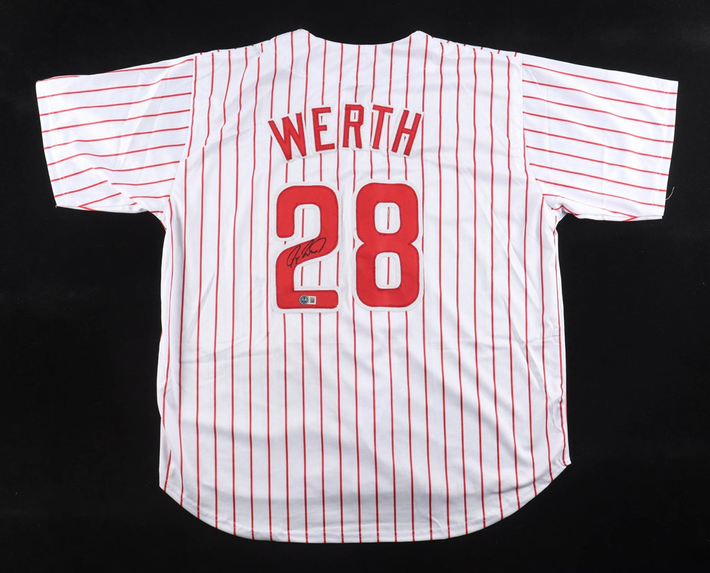 Custom on-field style jersey. Everything is sewn on, size adult XL. Hand-signed by Phillies Outfielder Jayson Werth.The autograph includes an official Beckett Authentication Services serially numbered hologram and QR Code card for authenticity purposes. The signing of this item was witnessed by Beckett.Authentication: Beckett Hologram with QR Code cardCustom on-field style jerseys are a more affordable option for autograph seekers. These jerseys do not have any brand name or tags and are made in the Philippines. They feature stitched on names and numbers and are made to look very similar to the on-field jerseys that the players wear. These custom jerseys are very commonly used in the memorabilia industry