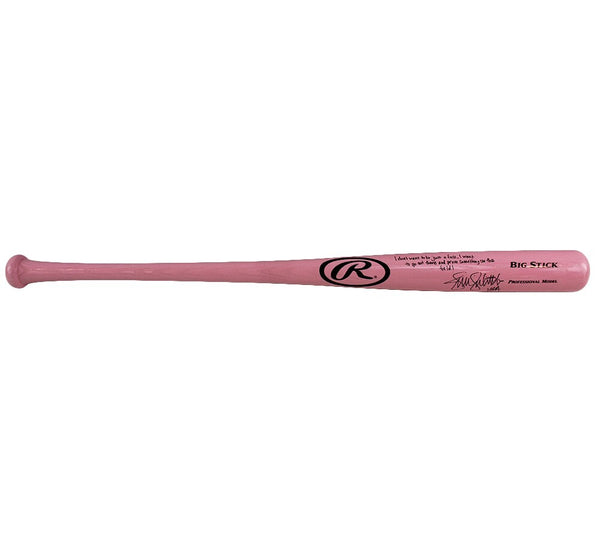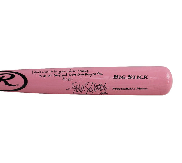 An Arizona Custom Big Stick Pink Bat Hand Signed by Jennie Finch. The item and signature are in excellent condition. In addition to signing her name, Jennie inscribed "I don't want to be just a face, I want to go out there and prove something on the field" on the item. Jennie is a Hall of Fame softball pitcher who led the University of Arizona to the 2001 Women's College World Series title and won Olympic gold in 2004 and silver in 2008 as a member of Team USA. AUTHENTICATION: The item is accompanied by a JSA Certificate of Authenticity - JSA Serial Numbered and Databased Hologram