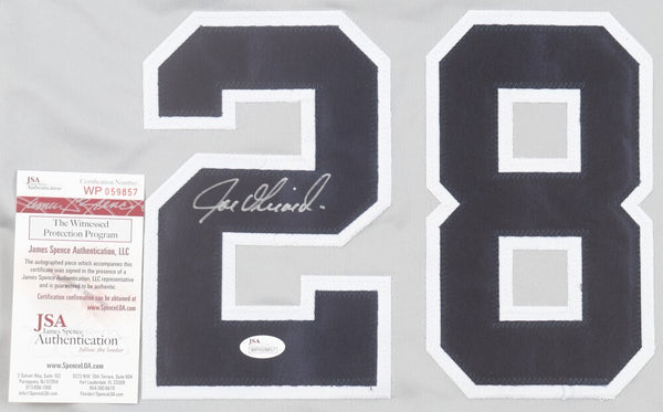 Custom on-field style jersey. Everything is sewn on, size XL. Hand-signed in silver paint pen by Joe Girardi. The autograph includes an official James Spence Authentication (JSA) hologram and matching COA for authenticity purposes. The signing of this item was witnessed by JSA.Authentication: JSA COA