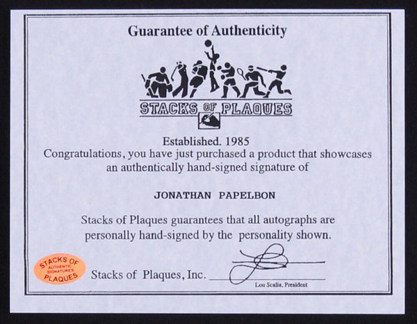 Majestic Authentic on-field style jersey. Everything sewn on, size 48. Hand-signed in black felt-tip pen by Jonathan Papelbon (Phillies). The autograph includes an official Stacks of Plaques - Est. 1985, celebrating 30 years in the business - hologram and matching COA for authenticity purposes.Authentication: Stacks of Plaques COA