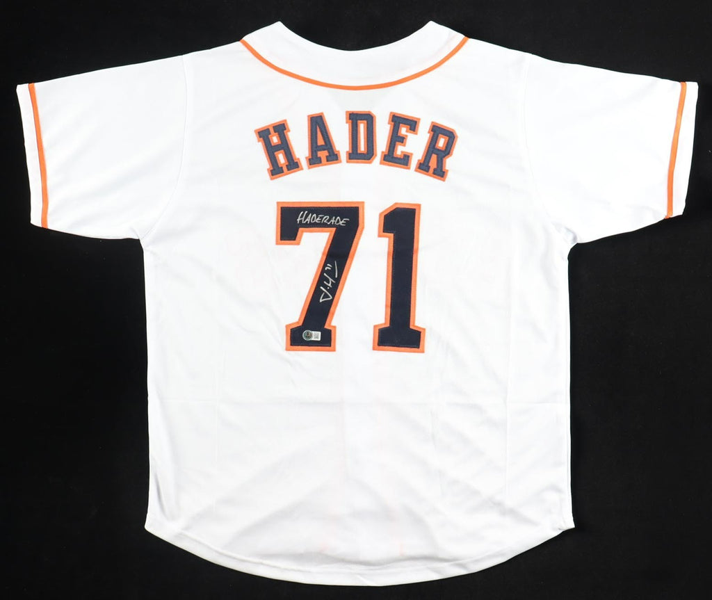 Custom jersey with everything sewn on, size XL. Hand-signed and inscribed "Haderade" by Josh Hader.The autograph includes an official Beckett Authentication Services serially numbered hologram and QR Code card for authenticity purposes. The signing of this item was witnessed by Beckett.Authentication: Beckett Hologram with Scannable QR Code card